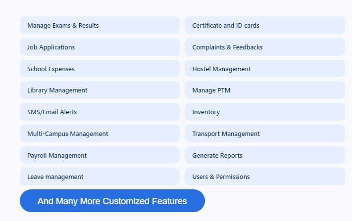 School management System (ERP) that suites to almost every school or educational institution from student admission to student leaving, from fees collection to exam results. It includes 30+ modules with 8 inbuilt users (Super Admin, Admin, Accountant, Teacher, Receptionist, Librarian, Parent and Student) panel.